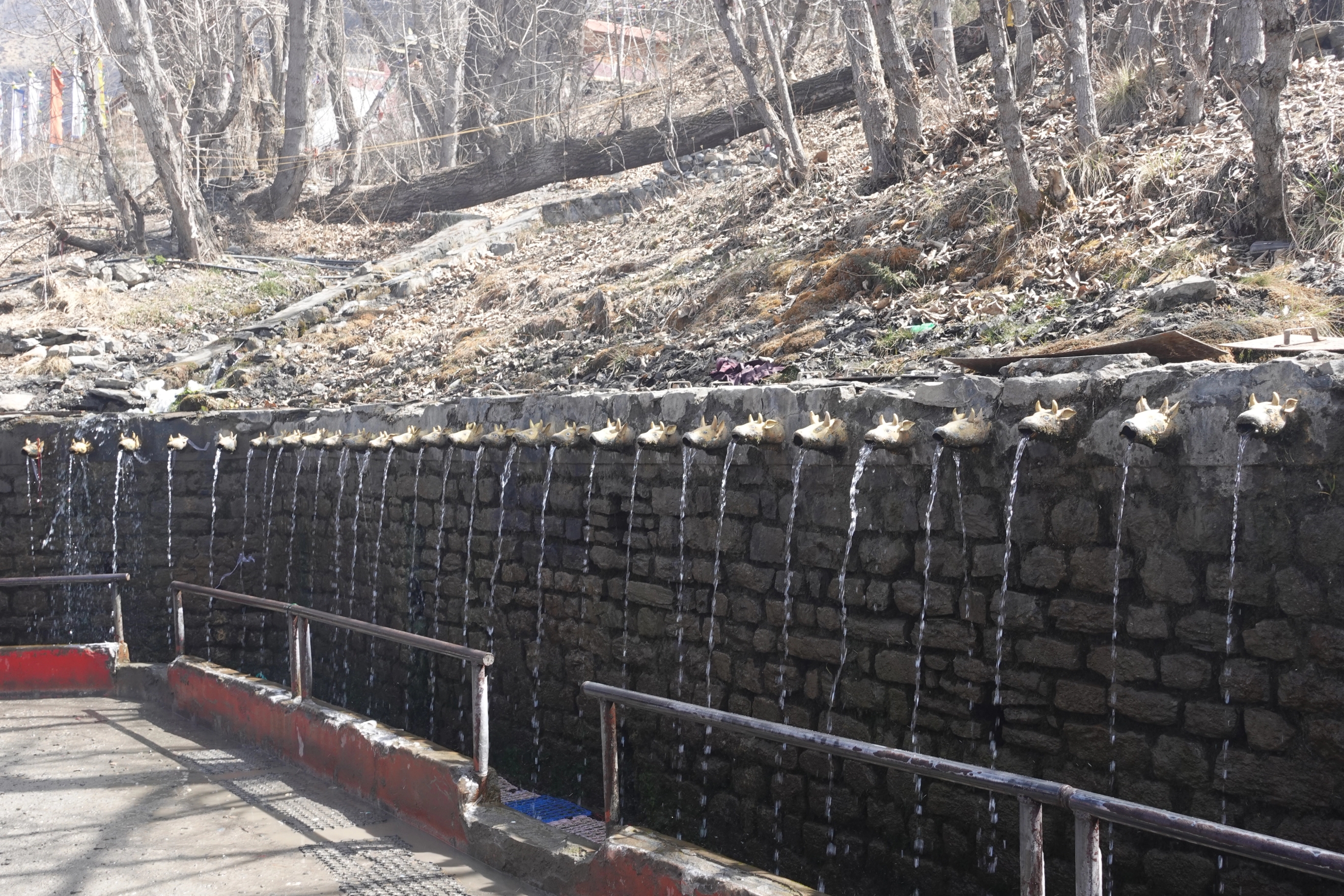 Vi kjørte langs fine elver, gjennom sjarmerende landsbyer og stoppet først i Tatopani, et sted med naturlig varme kilder. Jeg kan bekrefte at det virkelig var varme kilder, da jeg så vidt orket å dyppe tåen nede i vannet grunnet varmen.