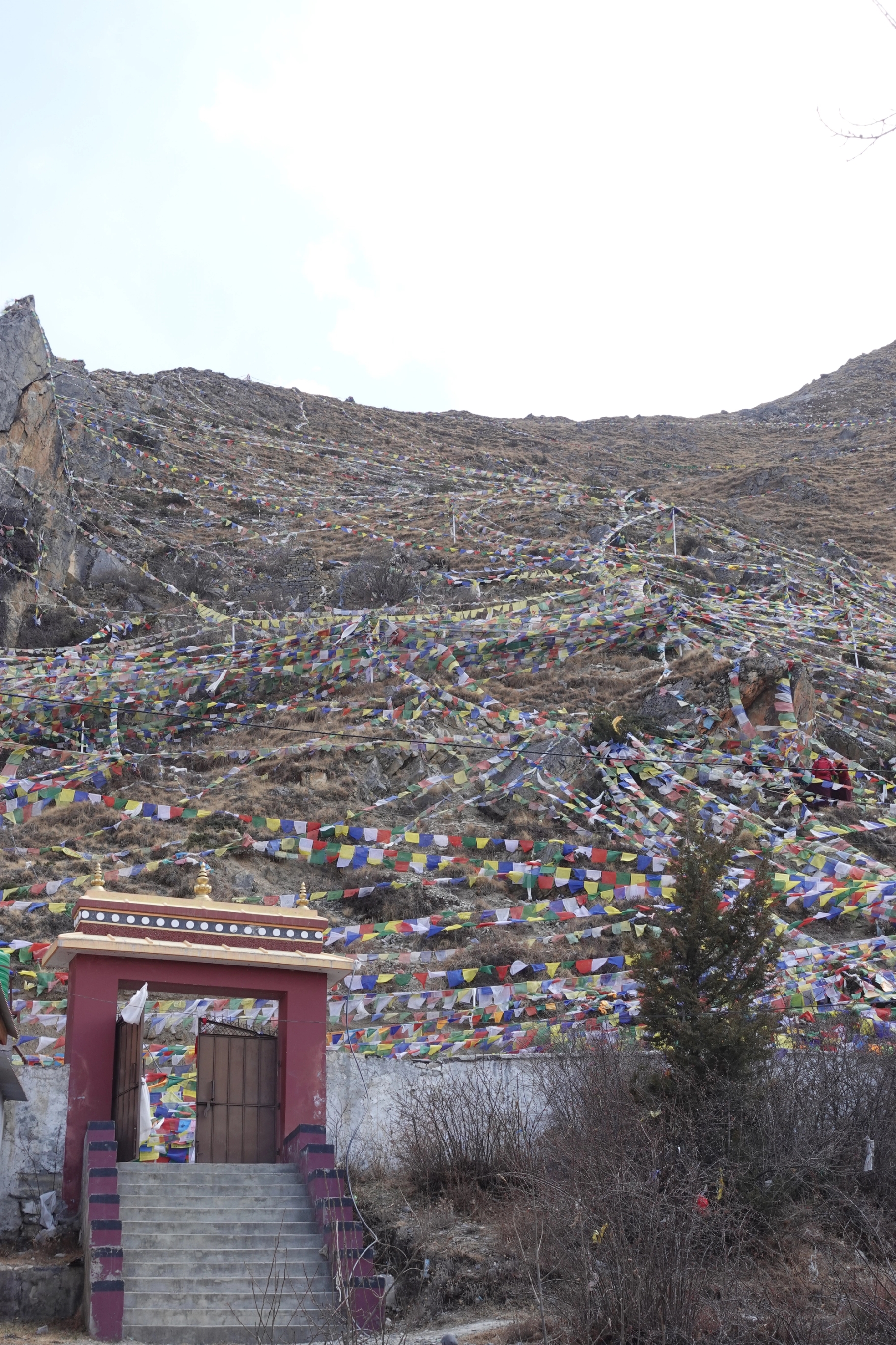 Hele fjellsiden er dekket i bønneflagg og på høyresiden kan man skimte en svær Buddhastatue like ved utkikkspunktet. Lenger til venstre i fjellsiden er Muktinath tempel, som er selve målet for reisen.