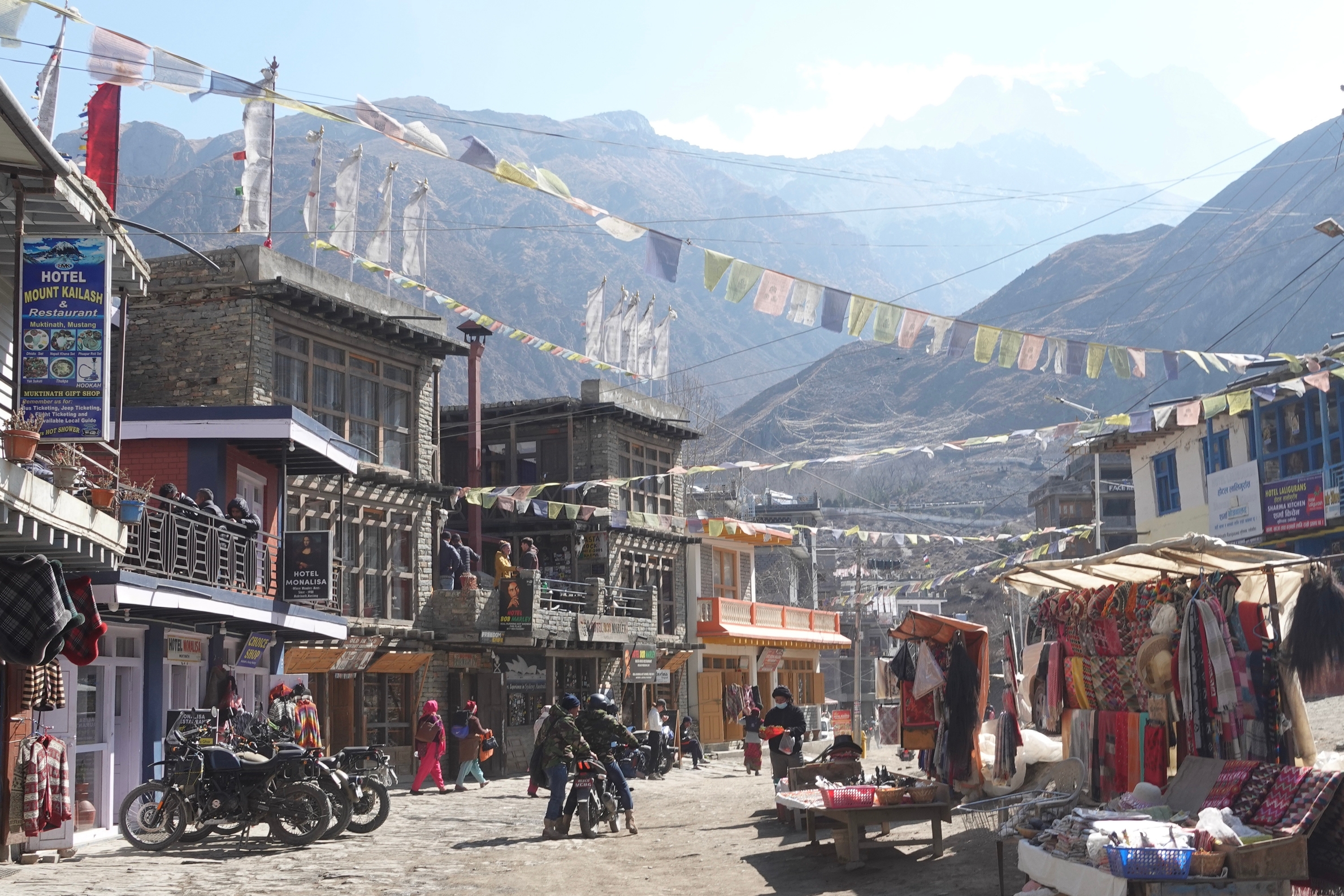 Likevel ble vi anbefalt å ikke overnatte der, på grunn av den ekstreme vinden. Derfor reiste vi videre til Marpha, en mer turistvennlig by kjent for sine epletrær og hvitmalte bygninger. Marpha kunne by på en "TikTok-gate", det er virkelig overalt her i Nepal selv i fjellandsbyer.