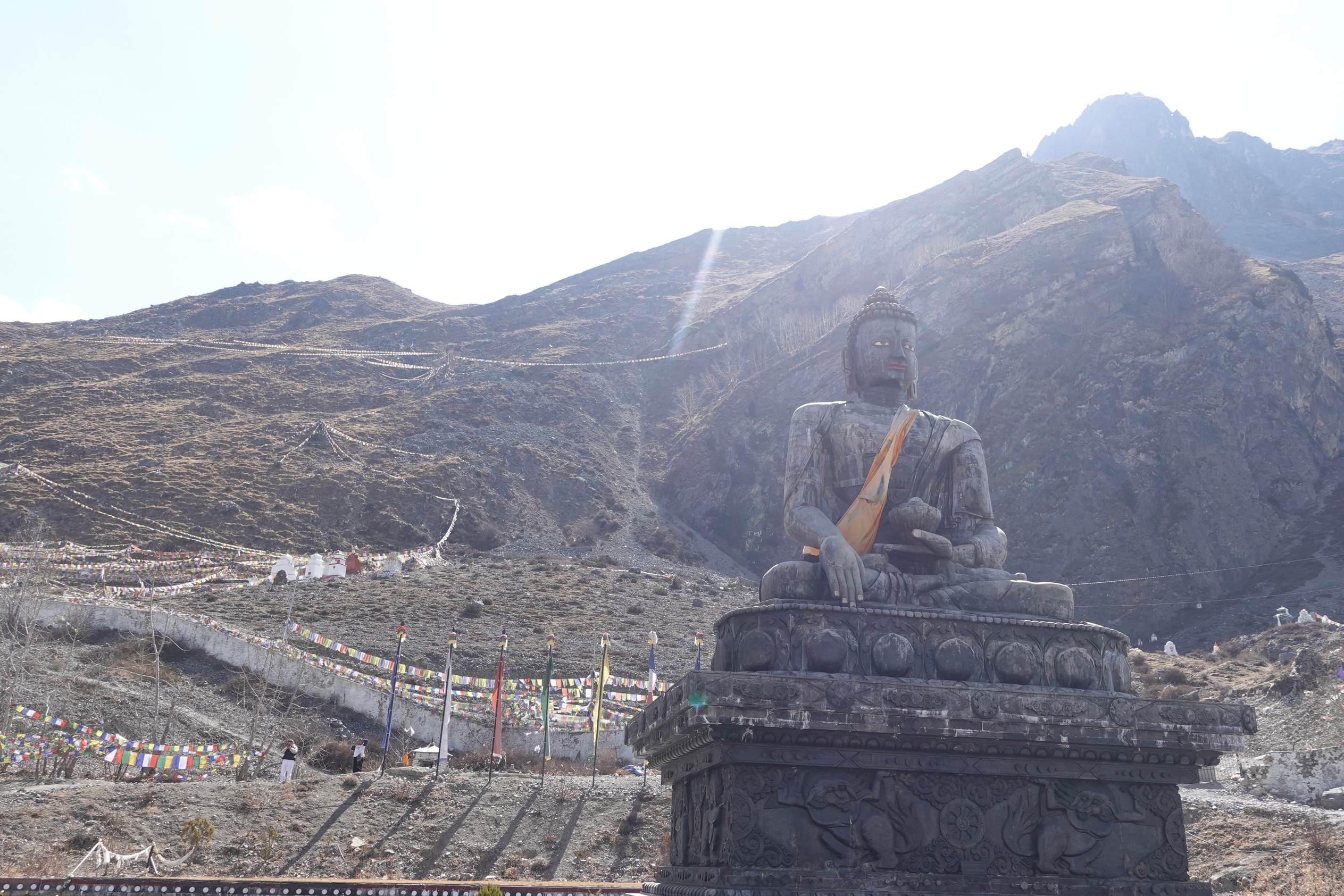Hele fjellsiden er dekket i bønneflagg og på høyresiden kan man skimte en svær Buddhastatue like ved utkikkspunktet. Lenger til venstre i fjellsiden er Muktinath tempel, som er selve målet for reisen.