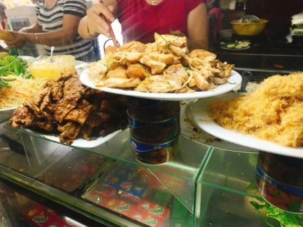 Kyllingris eller nudler passer godt til lunsj eller middag. I tillegg finnes det et mylder av andre typer kaker, juicer, grillet kjøtt, frukt, osv. langs gatene som lover å tilfredsstille nesten enhvers smak. Og de koster definitivt mindre.