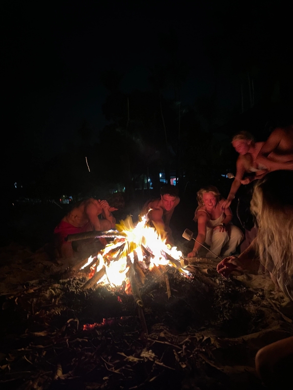 Det anbefales ikke å være på stranda alene på kvelden, men når vi har vært en større gruppe har vi noen kvelder blitt igjen en liten stund for å sitte rundt et av bålene på stranden etter solnedgangen.