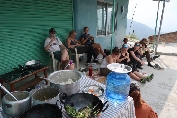 Som takk lagde Pabita Nepals nasjonalrett, Dal Bhat (Thakali), til oss. Dette deilige måltidet, laget med ferske grønnsaker og ris rett fra hagen, var dagens høydepunkt.