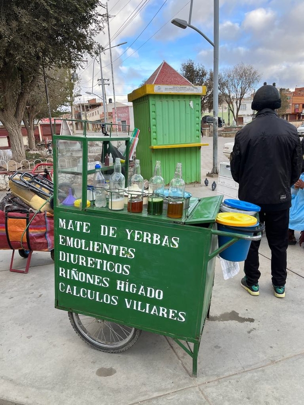 Bolivia og Argentina er i to forskjellige tidssoner, så den bolivianske grensa åpnet selvfølgelig en halv time senere enn den argentinske. Vi måtte dermed vente i ingenmannsland, bokstavelig talt. Etter immigrasjonen testa vi en lokal te-variant, før vi tok en minibuss opp til Uyuni.