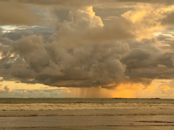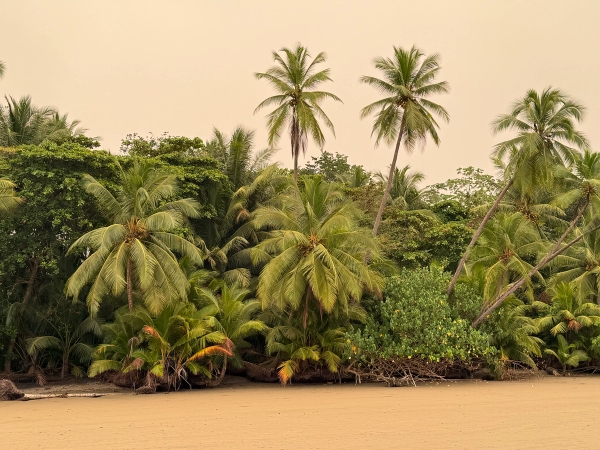 Synet av bølger oppover den beige stranden foran høye palmetrær fylt med kokosnøtter føltes uvirkelig, som en scene tatt ut av en film. Etter hvert gikk himmelen fra intens blå til grå, og fikk det grønne til å "poppe" ytterligere.