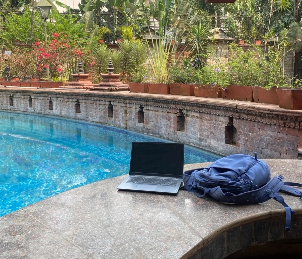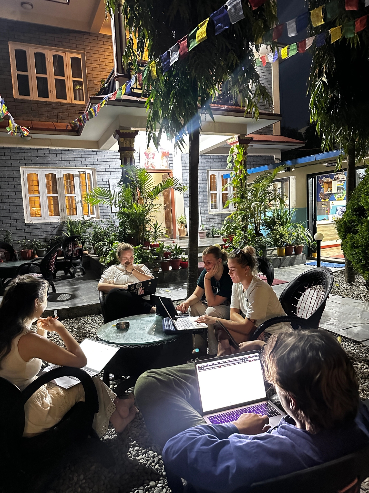 Det er stille og privat, og du kan både finne et sted i solen – eller under et tak hvis det regner eller er for varmt. Det er også mulig å kjøpe en kaffe for 100 rupier som tilsvarer mindre enn 10 norske kroner. Kanskje får du også selskap av en av huseiernes søte hunder?